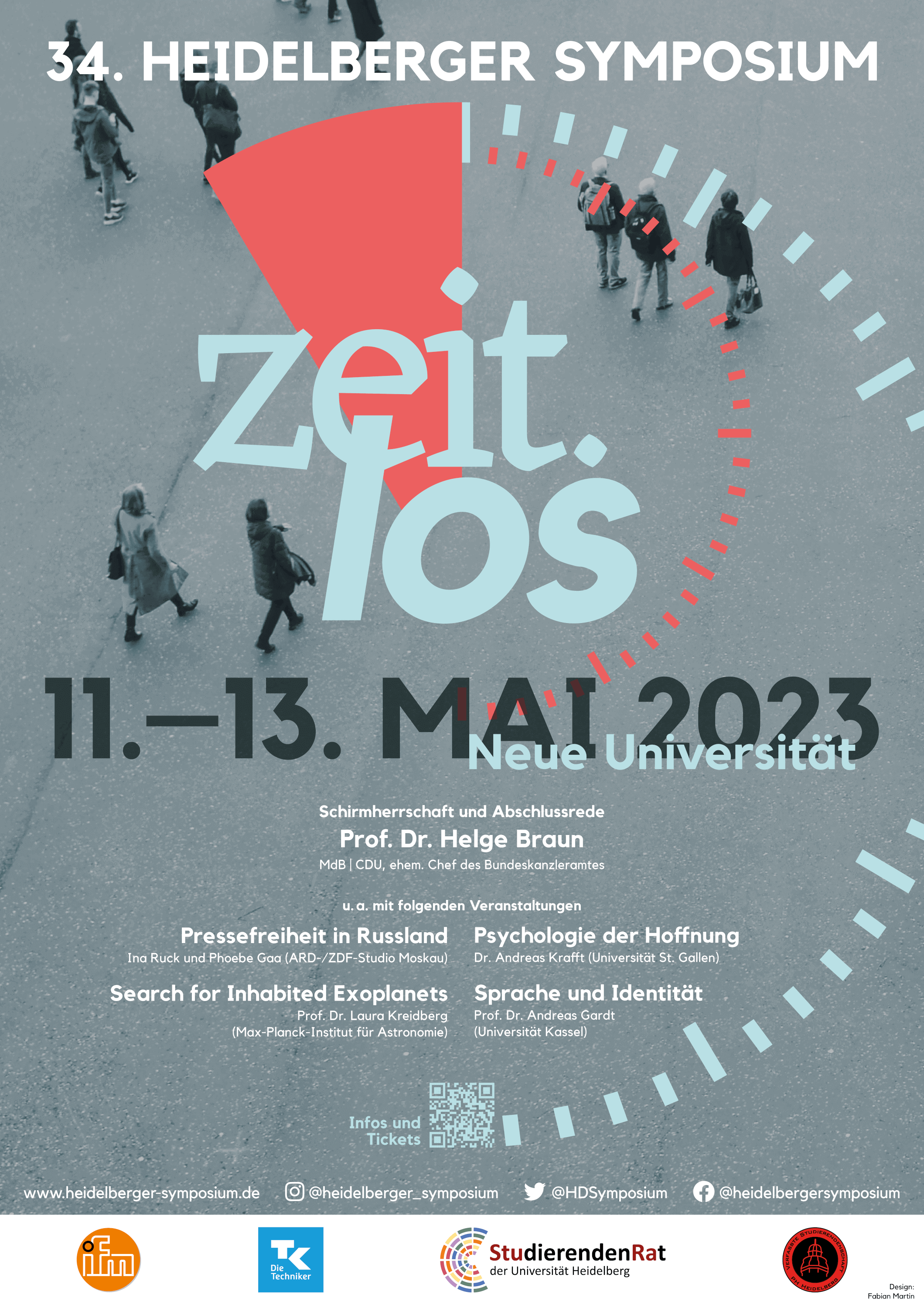 Das 34. Heidelberger Symposium fand vom 11. bis 13. Mai 2023 unter dem Thema „zeit.los“ auf dem Heidelberger Universitätsplatz und in der Neuen Universität statt. Die Schirmherrschaft trug der ehemalige Chef des Bundeskanzleramtes Helge Braun. Eröffnungsredner war der Science-Fiction-Schriftsteller Andreas Eschbach. Referierende waren unter anderem: